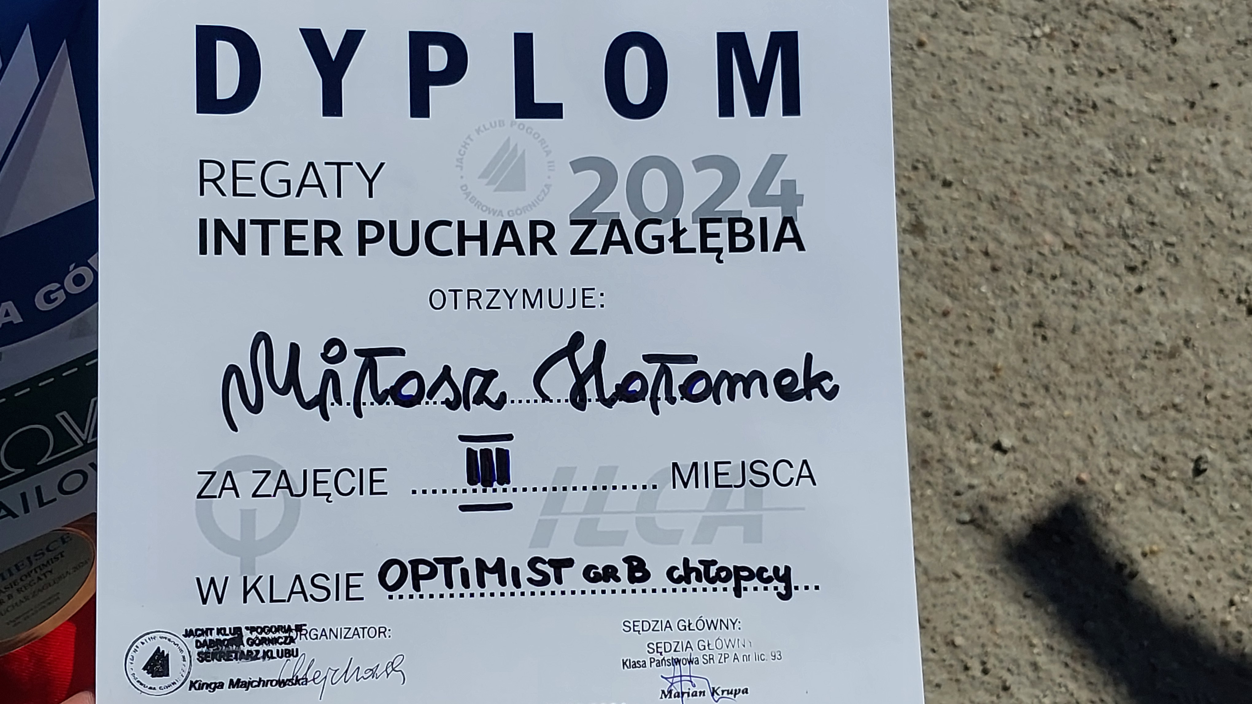 W miniony weekend odbyły się regaty w Dąbrowie Górniczej. W sobotę było bardzo deszczowo i mało wiatru, więc po czterech godzinach czekania na wodzie, z trudem odbyły się dwa wyścigi.Niedziela była lepsza, ponieważ wiał nieco lepszy wiatr, i przede wszystkim było ciepło. W tym dniu również odbyły się dwa wyścigi.Nasza najlepsza zawodniczka - Natalia, zajęła pierwsze miejsce w swojej kategorii. Sukces odniósł również Miłosz, zajmując trzecie miejsce.Gratulujemy takich dobrych wyników, szczególnie Miłoszowi, ponieważ jest to jego pierwszy raz na podium.