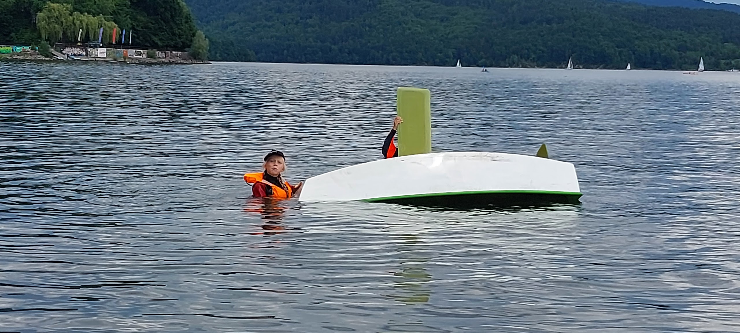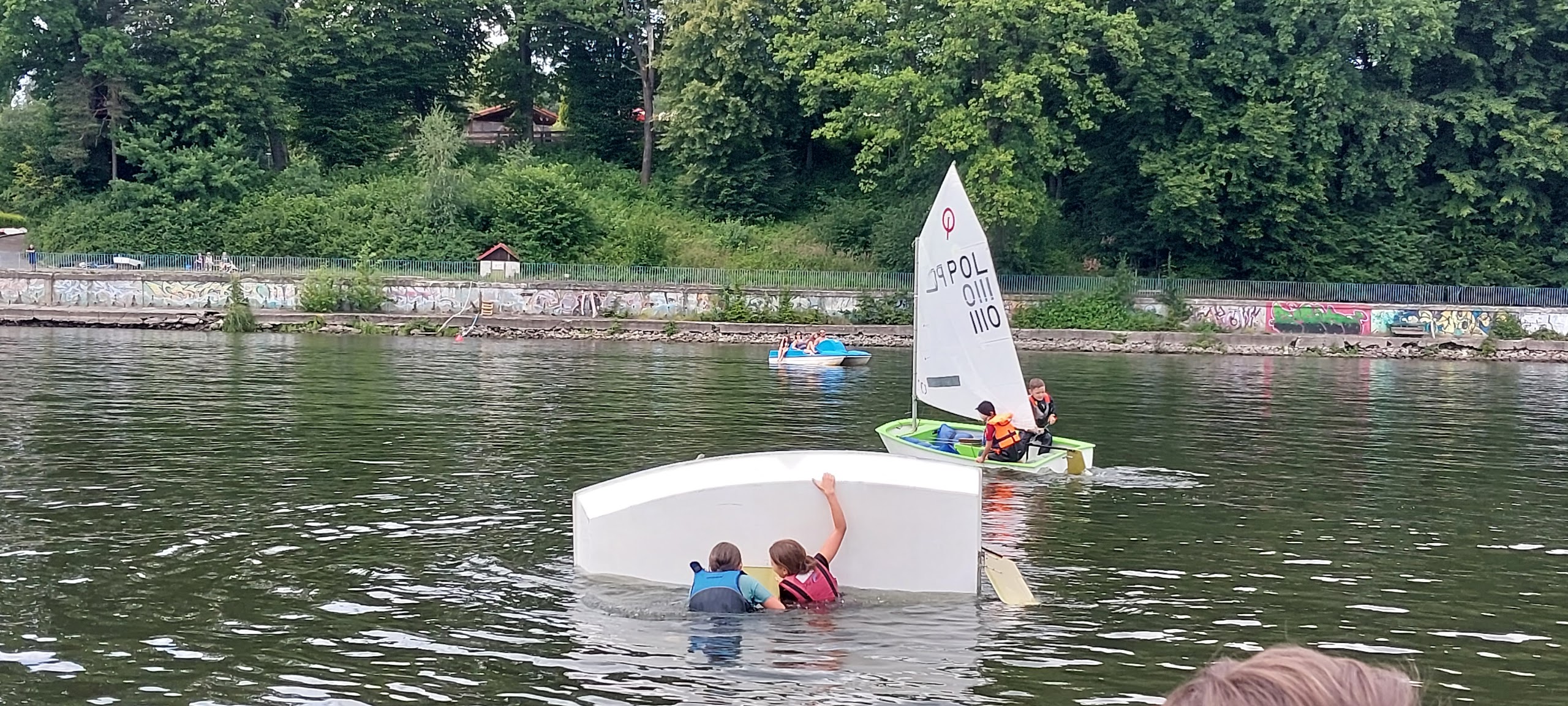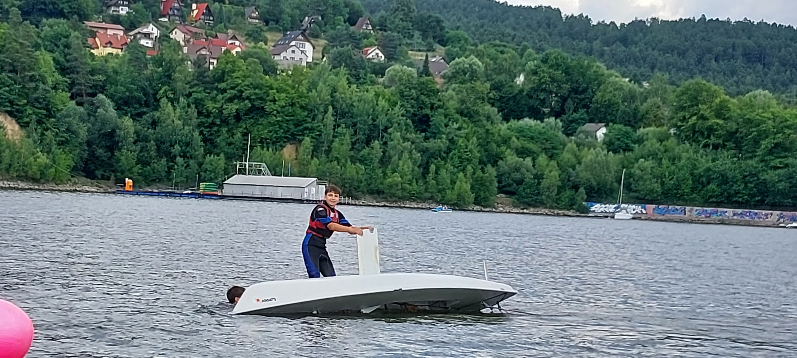 Dziś był ostatni dzień szkółki, w którym uczestnicy mieli szansę wykazać się zdobytymi umiejętnościami.Najpierw pływaliśmy po dwóch rozstawionych bojach. Po południu mieliśmy okazję powywracać łódki. Każdy uczestnik wykonał „grzyba” i postawił łodkę.Następnie, po zejściu z wody miało miejsce zakończenie szkółki. Wszyscy dostali dyplom oraz upominki - model żaglówki, brelok i zakładkę do książki.